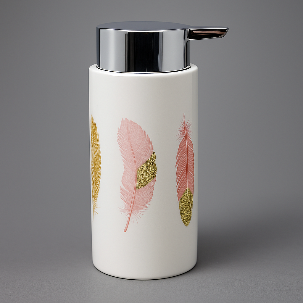 Porta sapone liquido della serie amazzonia, caratterizzato da una grafica elegante con piume colorate che donano un tocco naturale e raffinato all’ambiente bagno. Realizzato in ceramica di alta qualità con dispenser cromato resistente e pratico.