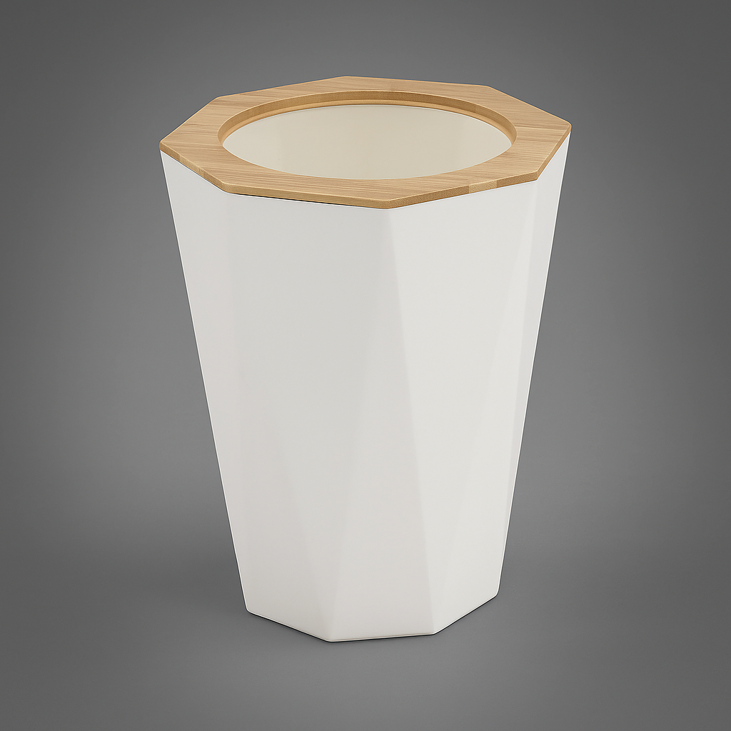 Pattumiera elegante della serie adriatica con corpo bianco e bordo superiore in bambù naturale. Ideale per mantenere ordine e pulizia nel bagno o in altri ambienti della casa, unisce funzionalità e design moderno. Facile da pulire e leggera da spostare.