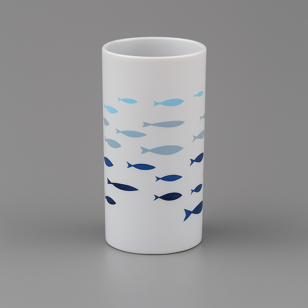 Pratico portabicchiere con elegante decoro a pesci blu, ideale per il bagno. Perfetto come bicchiere per sciacqui o come contenitore multiuso, unisce design moderno e funzionalità.