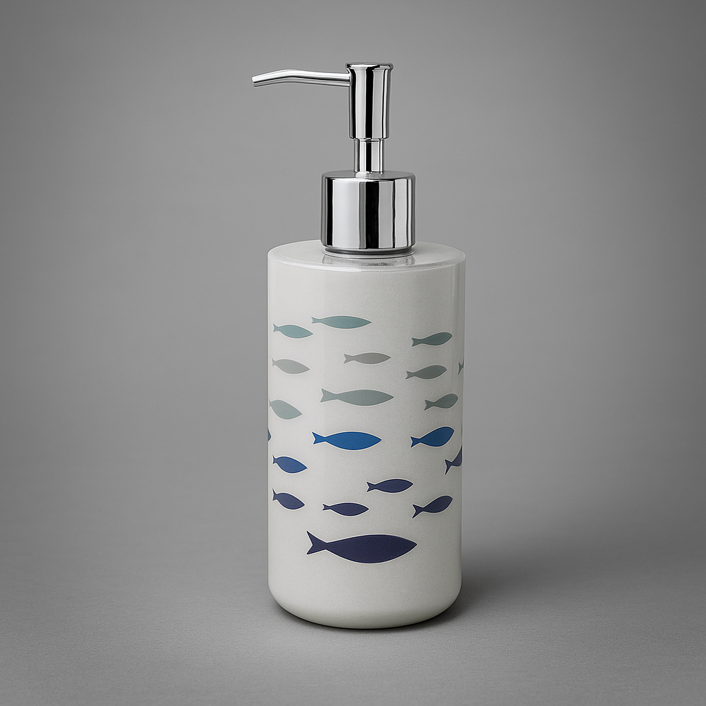 Moderno dispenser per sapone liquido con decoro a pesci colorati. Realizzato in materiale resistente con pompa cromata, unisce praticità e design, ideale per bagno e cucina.