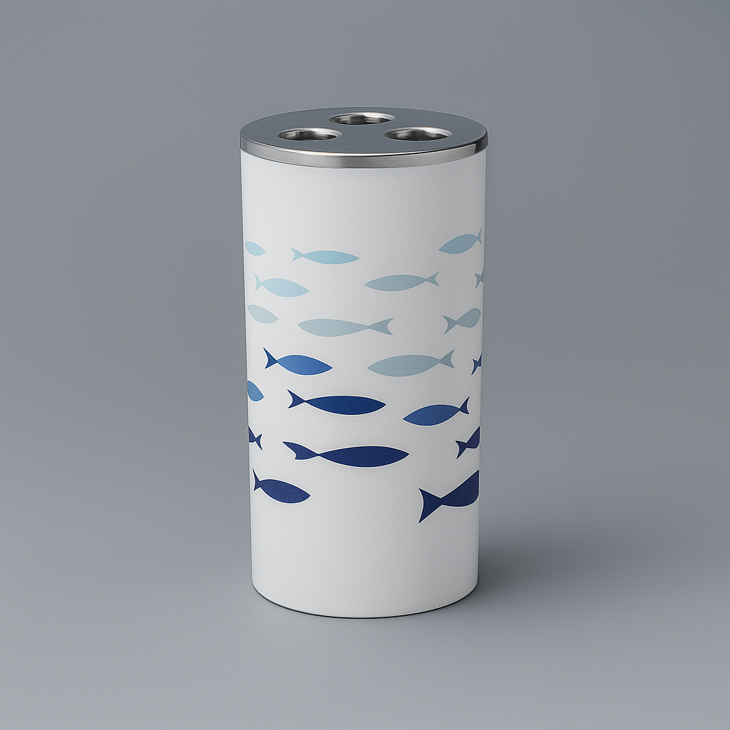 Allegro porta spazzolino decorato con motivo a pesci colorati, ideale per organizzare spazzolini e dentifricio. Realizzato in materiale resistente, unisce praticità e design moderno per il bagno.