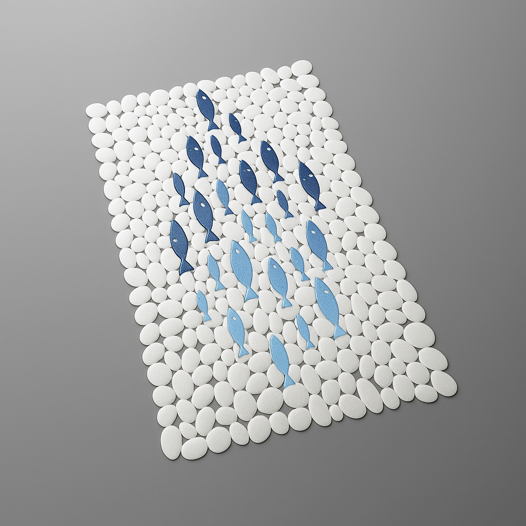 Funzionale tappeto antiscivolo per doccia e vasca, decorato con pesci blu e azzurri su base bianca. Realizzato in materiale resistente e sicuro, garantisce stabilità e comfort durante l’uso quotidiano.