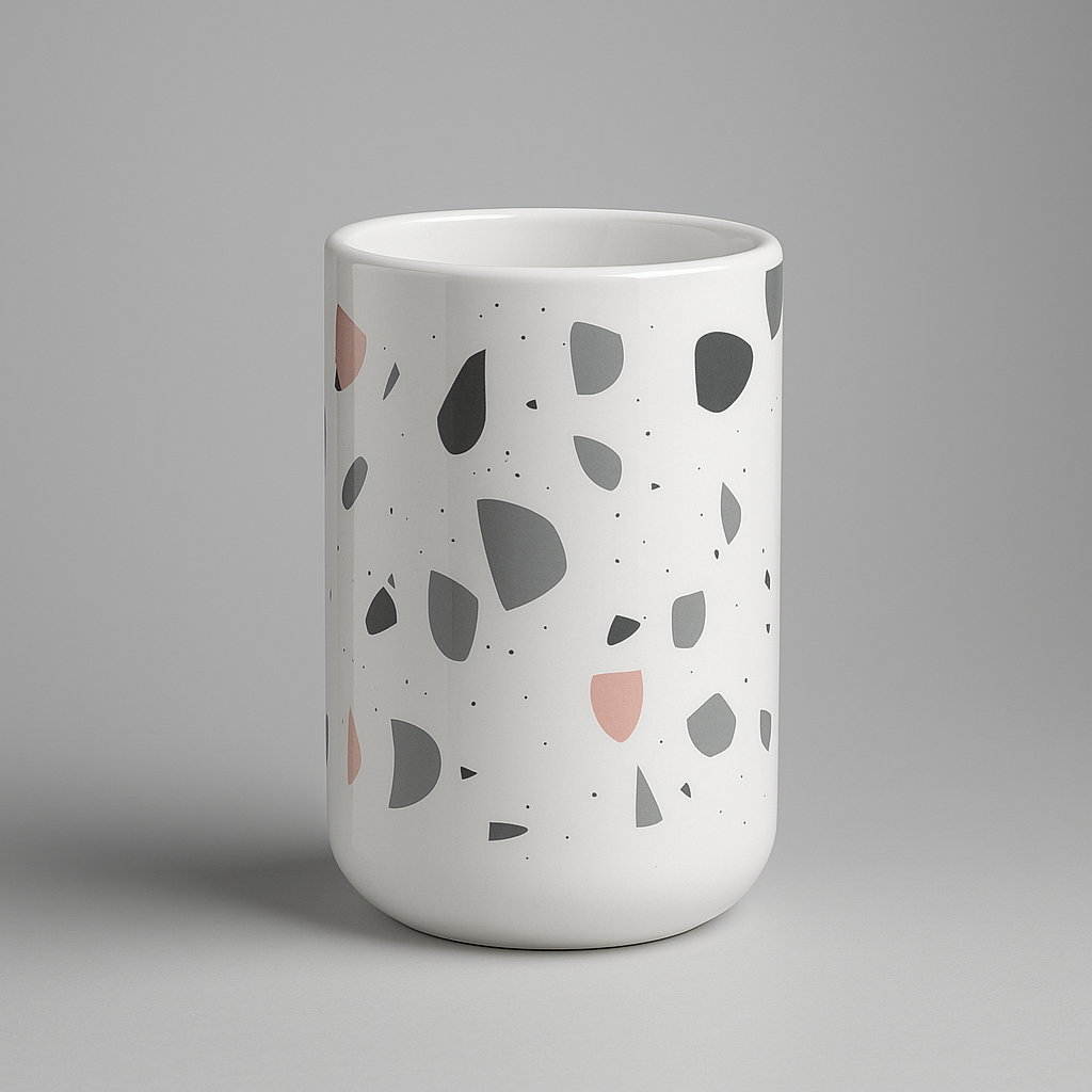 Bicchiere della linea isola con elegante effetto terrazzo multicolore su base bianca. Ideale come porta spazzolini o contenitore multifunzione, aggiunge un tocco moderno e raffinato al bagno.