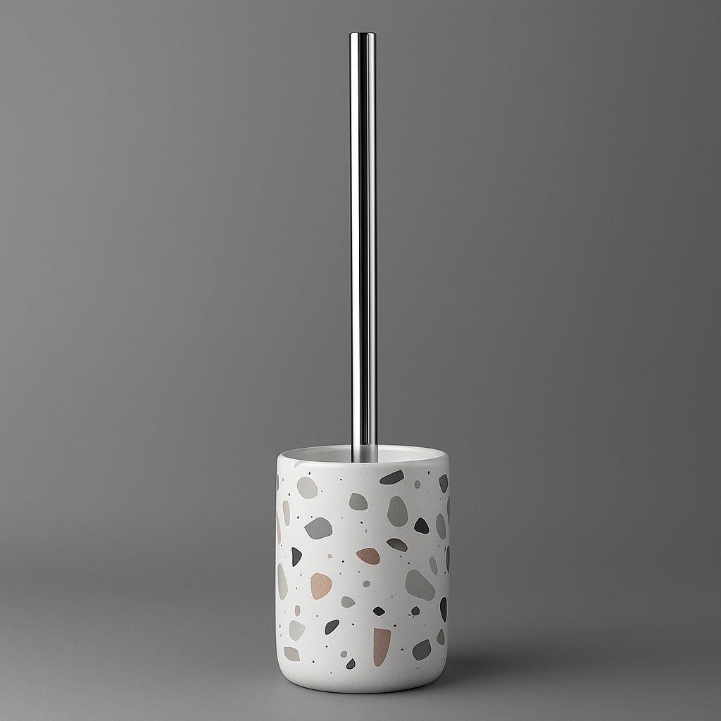 Porta scopino della linea isola con design effetto terrazzo multicolore su base bianca. Completo di scopino con manico in acciaio inox, garantisce resistenza e praticità. Un accessorio indispensabile per mantenere l’igiene del bagno con stile moderno.