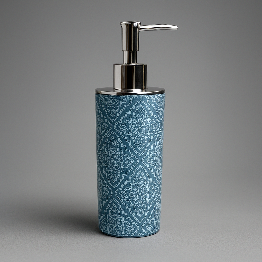 Elegante dispenser per sapone liquido in materiale PS con motivo marine. Dotato di pompa in acciaio cromato, garantisce resistenza e praticità nell’uso quotidiano.