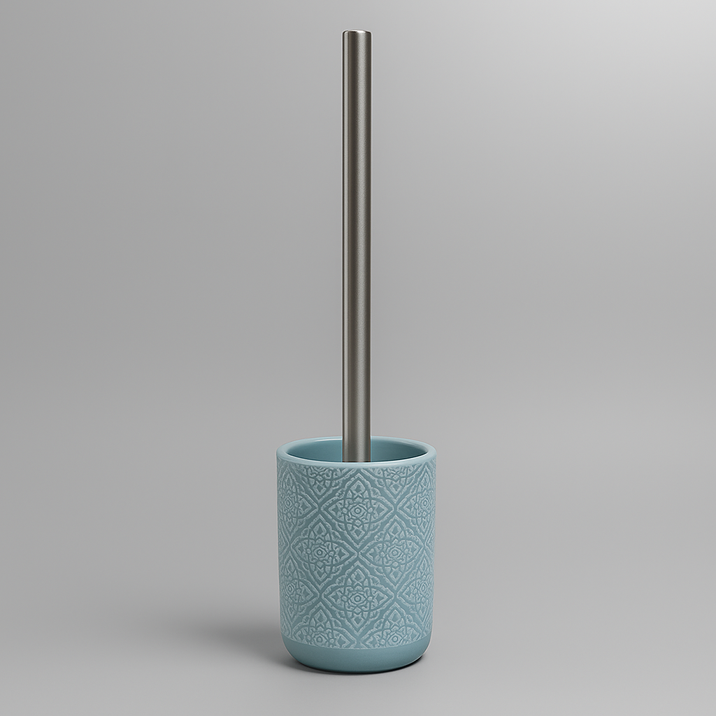 Elegante porta scopino con contenitore in ceramica decorato marine e manico in acciaio inox. Un accessorio resistente e funzionale che unisce praticità e stile, perfetto per mantenere il bagno sempre ordinato.