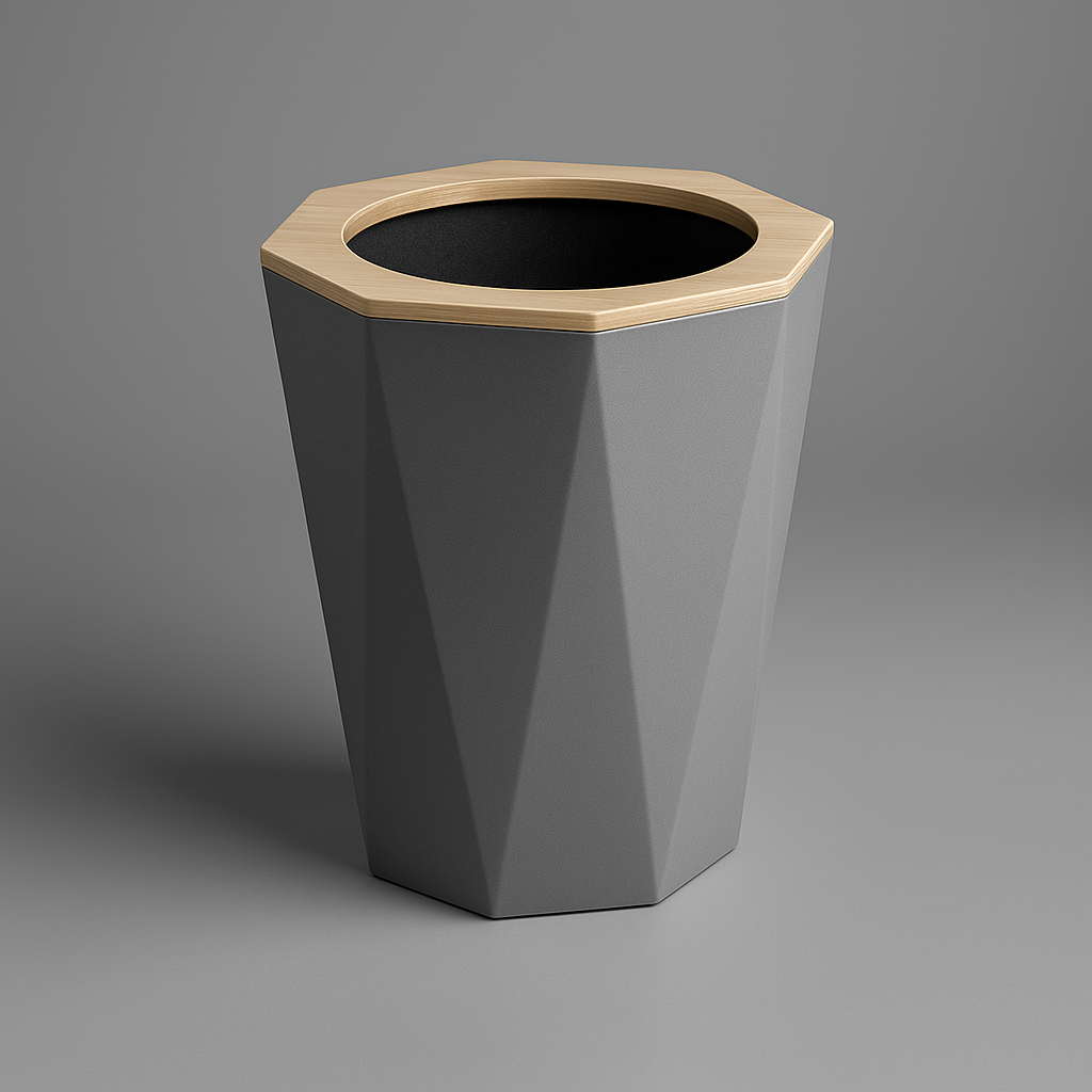 Pattumiera della linea pietra dal design geometrico con finitura effetto pietra e bordo in bambù naturale. Compatta ed elegante, è ideale per il bagno o piccoli ambienti, unendo praticità e stile moderno.