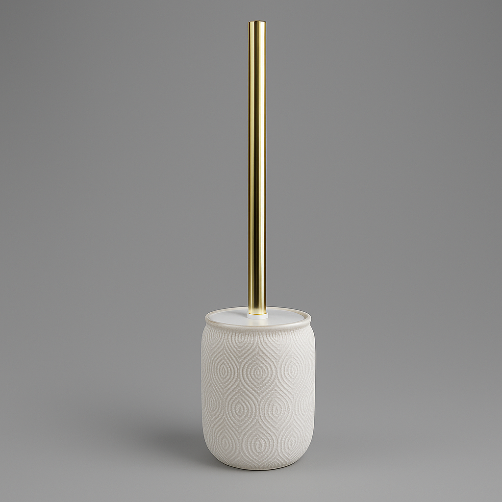 Il porta scopino della serie Polo è realizzato in ceramica bianca decorata con manico in metallo dorato, che unisce praticità e design elegante. Perfetto per completare con stile il set da bagno coordinato.