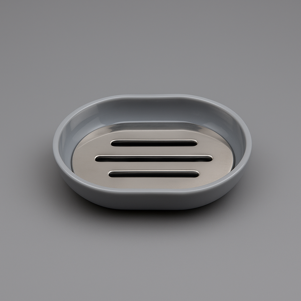 Porta sapone della serie saronno, dal design moderno e lineare. Realizzato in plastica resistente con finitura grigio elegante, è dotato di base interna removibile per mantenere il sapone asciutto e igienico. Ideale da abbinare agli altri accessori della stessa linea per un bagno coordinato.