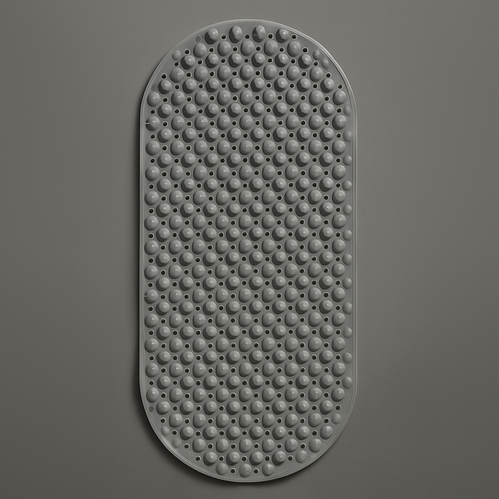 Tappeto antiscivolo della serie saronno con forma rettangolare arrotondata, ideale per docce e vasche. Realizzato in PVC resistente, è dotato di numerose ventose sul retro che assicurano aderenza e stabilità durante l’uso. La superficie massaggiante garantisce comfort sotto i piedi e sicurezza antiscivolo.