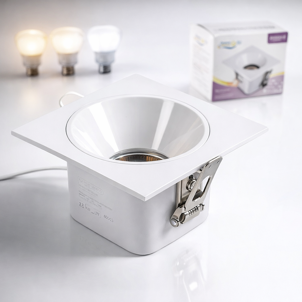 Il design quadrato con finitura bianca si integra perfettamente in ambienti moderni e minimal. Le molle laterali in acciaio garantiscono un fissaggio stabile e rapido nel controsoffitto in cartongesso.
