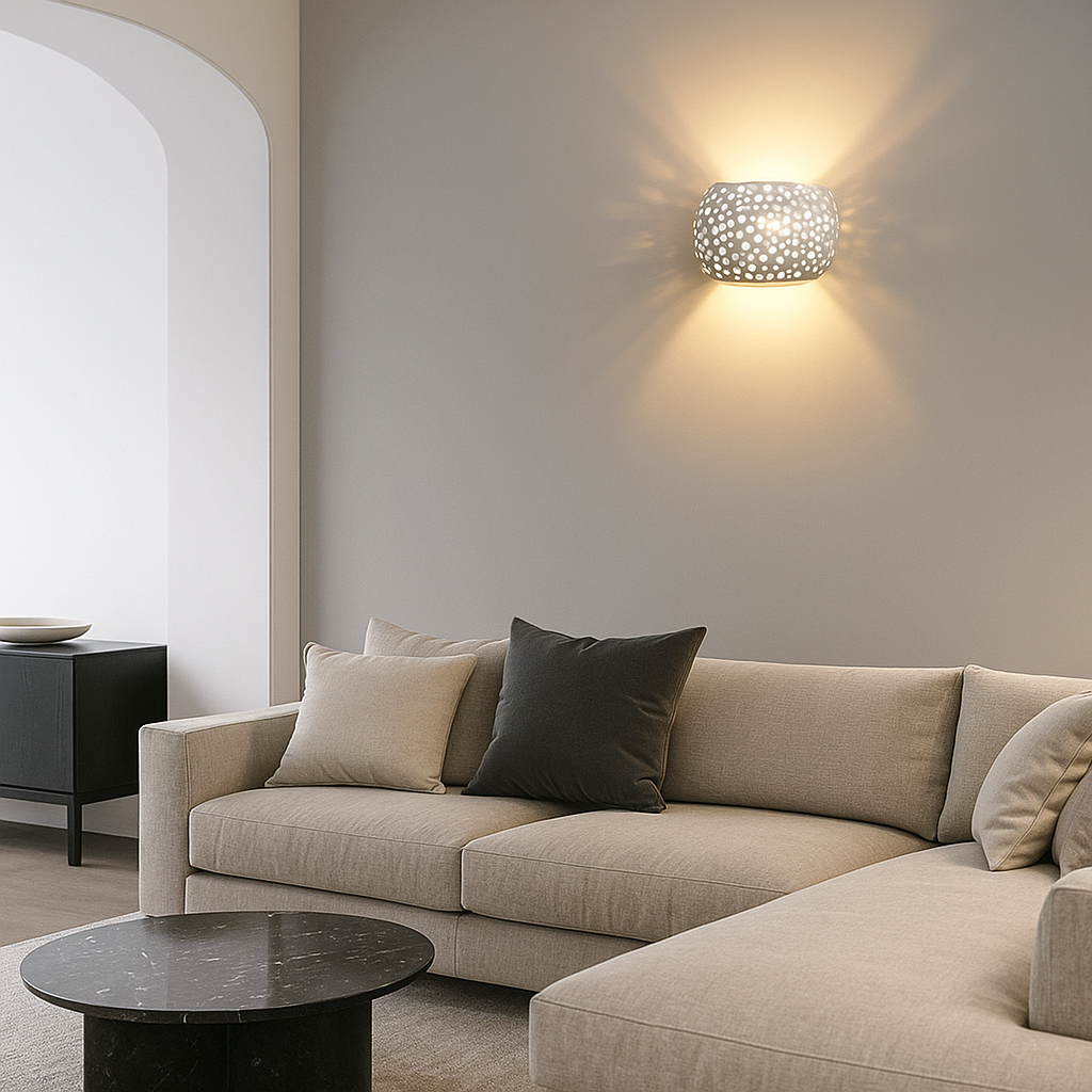 l’applique in gesso e42 è una lampada da parete dal design moderno con fori decorativi che creano giochi di luce unici. realizzata in gesso verniciabile, permette di personalizzare il colore e lo stile per adattarsi perfettamente a qualsiasi ambiente interno. ideale per chi desidera un’illuminazione elegante e discreta con un tocco artistico.