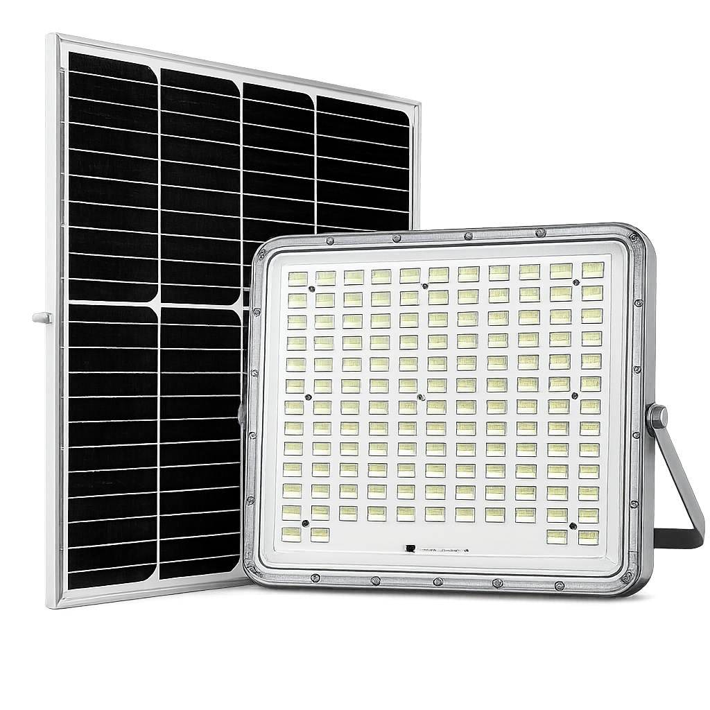 faro led solare ad alta potenza da 1000w progettato per illuminazione esterna professionale. ideale per giardini, cortili, capannoni, parcheggi e aree industriali, garantisce luce intensa e risparmio energetico totale grazie all’alimentazione solare.