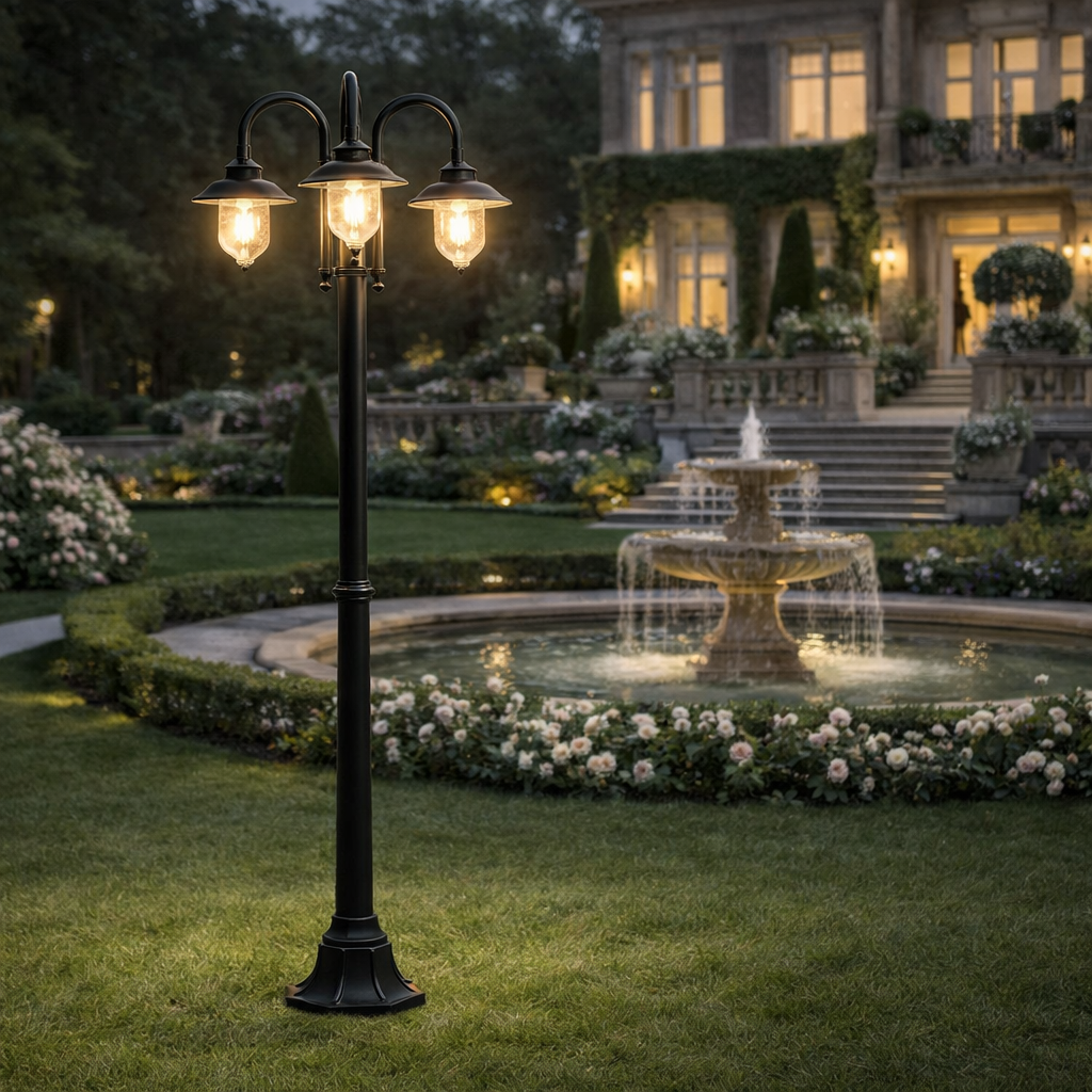 Il lampione da giardino PT-03B è una soluzione elegante e funzionale per l’illuminazione di spazi esterni come giardini, vialetti, cortili e aree residenziali. Il design classico con tre punti luce garantisce una luce ampia e uniforme, migliorando sicurezza e visibilità nelle ore serali.