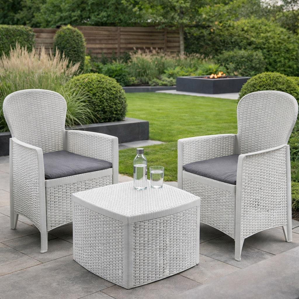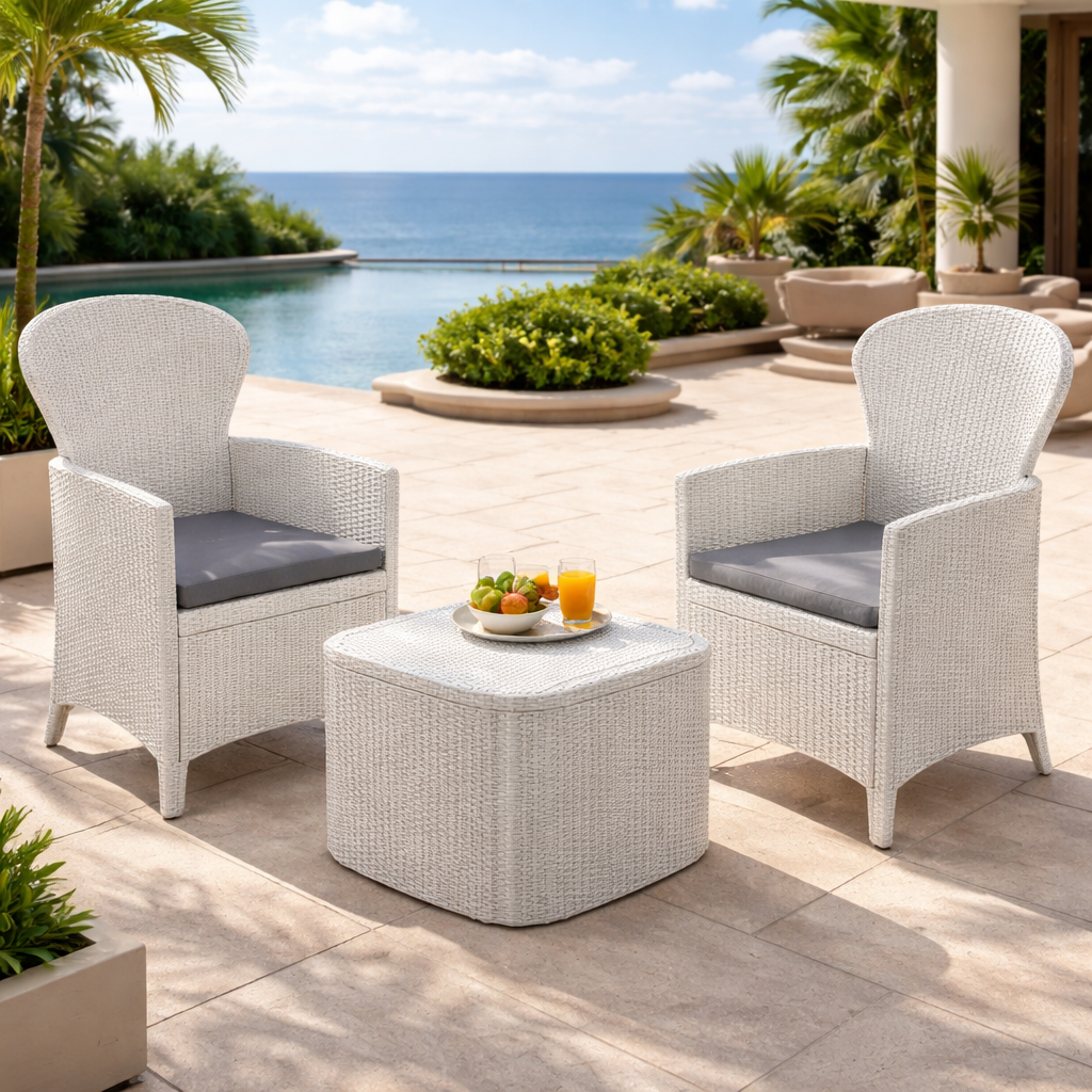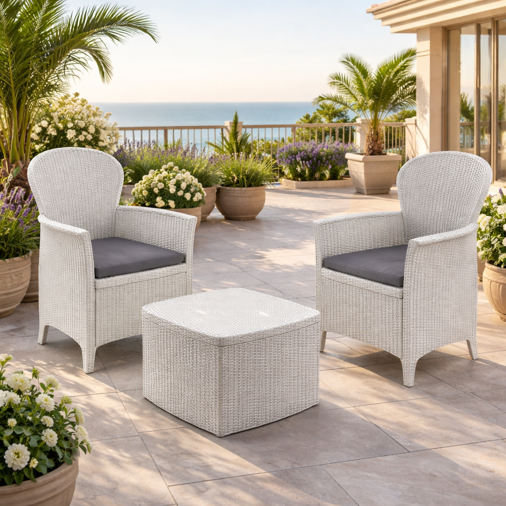 Realizzato in polipropilene resistente effetto rattan intrecciato, il set garantisce durata nel tempo e resistenza agli agenti atmosferici. Il design moderno e compatto lo rende adatto anche a spazi ridotti come balconi o piccoli terrazzi. :contentReference[oaicite:0]{index=0}