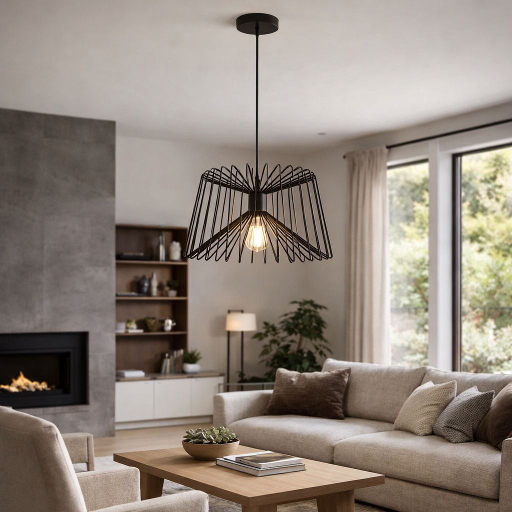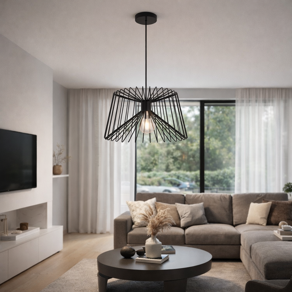 Elegante lampadario a sospensione modello LP-52N con attacco E27, ideale per ambienti moderni e industriali. La struttura in metallo nero con design geometrico dona carattere e personalità a soggiorni, cucine, locali e showroom.
