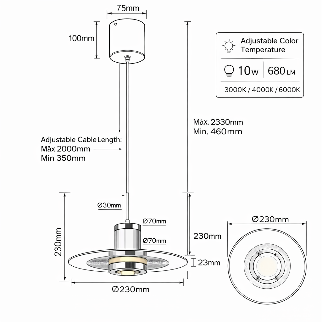 Il cavo di sospensione regolabile fino a 2 metri permette di personalizzare l’altezza di installazione, rendendolo adatto a diverse configurazioni e altezze di soffitto.