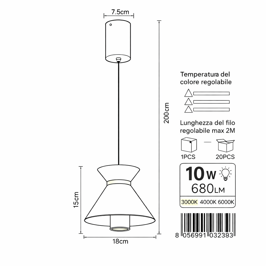 Il cavo di sospensione regolabile fino a 2 metri offre grande flessibilità di installazione, adattandosi a diverse altezze e configurazioni di spazio.