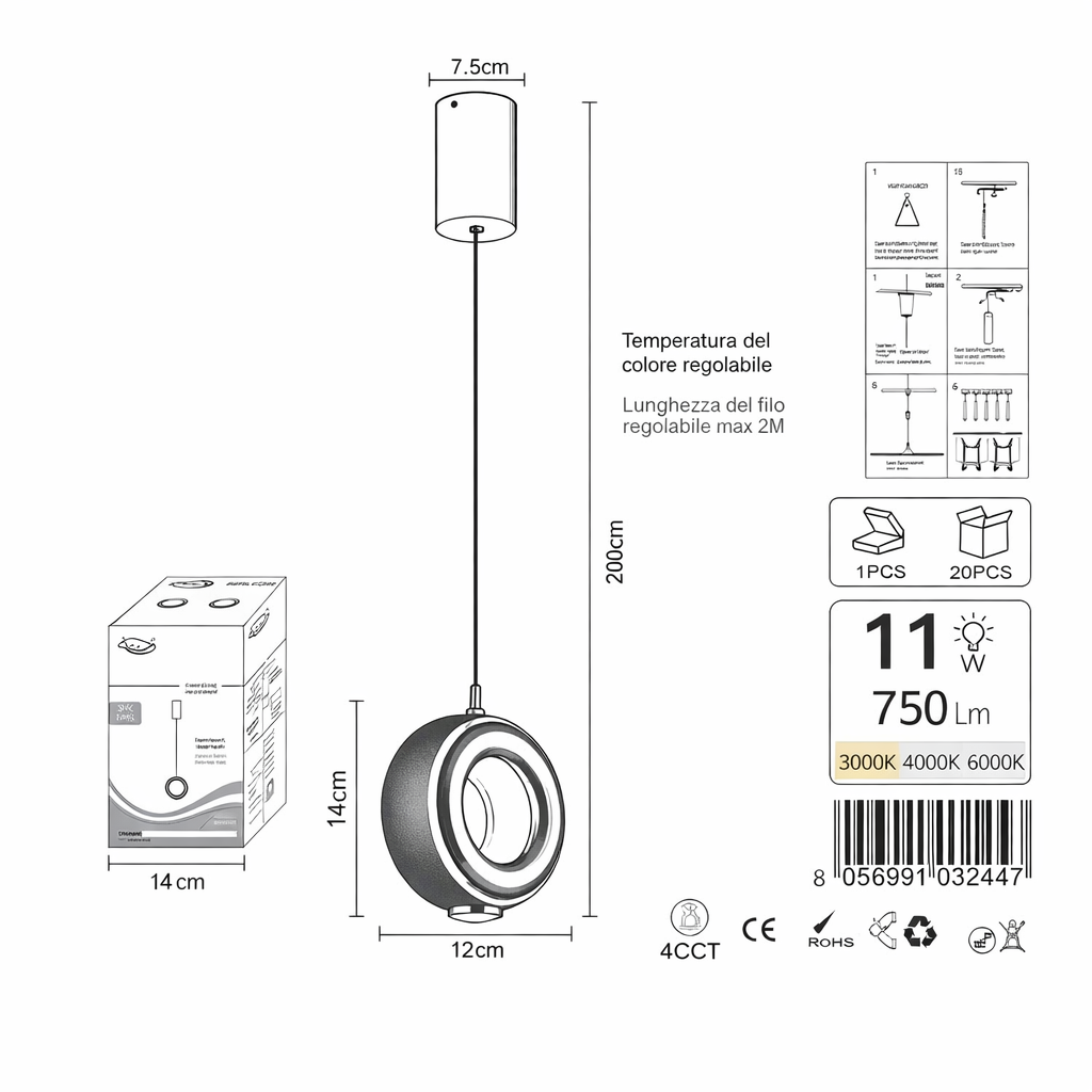 Il lampadario a sospensione LED 11W è una soluzione moderna e decorativa, caratterizzata da un design circolare elegante e distintivo. Ideale per ambienti residenziali e commerciali come soggiorni, sale da pranzo, cucine, uffici e locali, unisce funzionalità e stile in un unico elemento.