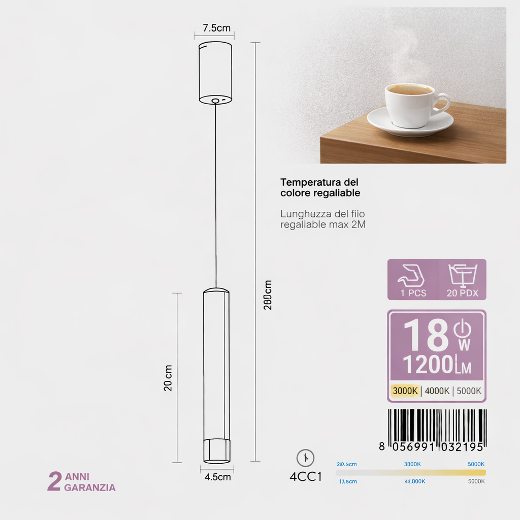 Il lampadario a sospensione LED 18W è una soluzione elegante e moderna, caratterizzata da un design cilindrico slanciato che dona un tocco raffinato agli ambienti. Ideale per cucine, isole, banconi, soggiorni e spazi commerciali, rappresenta una perfetta combinazione tra estetica e funzionalità.