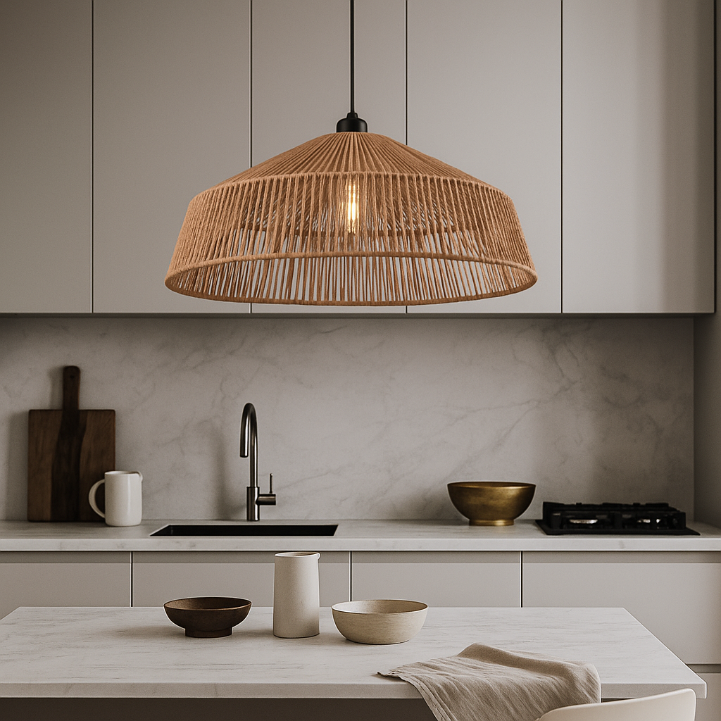 la lampada a sospensione lp-48-g è un lampadario dal design contemporaneo con elementi naturali. il paralume in corda di carta intrecciata crea un’atmosfera calda e accogliente, ideale per dare carattere e stile a qualsiasi ambiente interno. perfetta per chi cerca un’illuminazione decorativa e funzionale con un tocco artigianale.