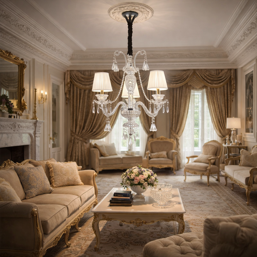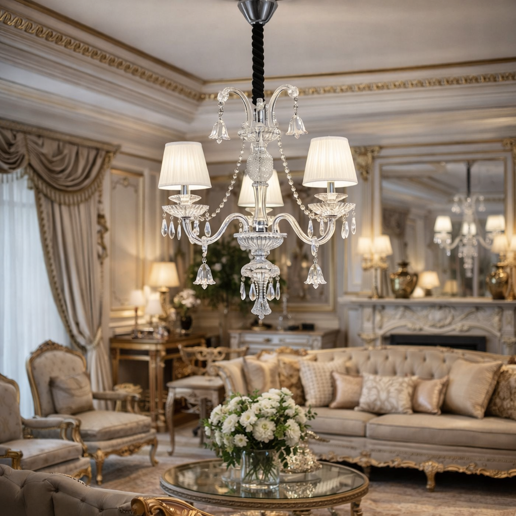 Questo lampadario unisce estetica e funzionalità, offrendo una luce calda e accogliente. I paralumi diffondono la luce in modo uniforme, mentre i cristalli creano effetti luminosi brillanti e raffinati, valorizzando l’ambiente.
