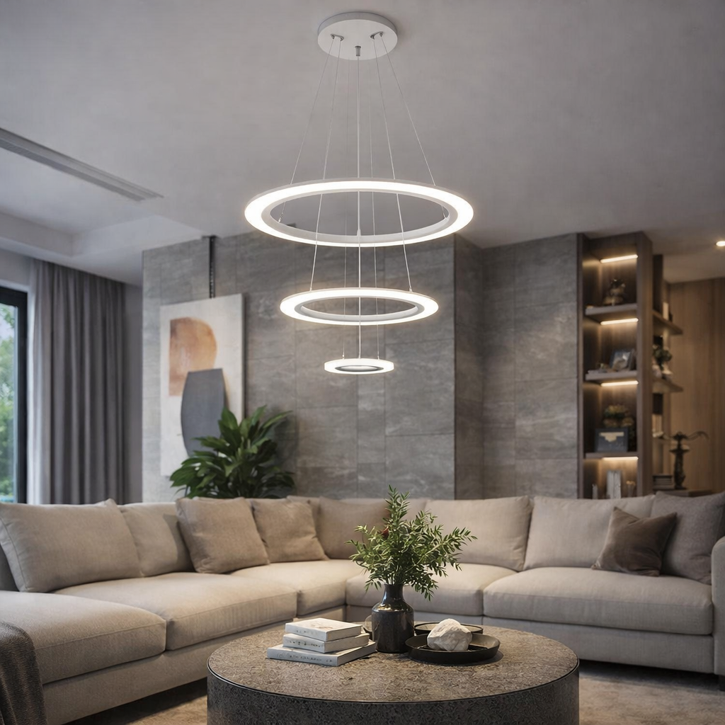 Elegante lampadario LED modello A66-B3C da 68W con design moderno ad anelli sospesi, perfetto per ambienti contemporanei come soggiorni, sale da pranzo e open space.