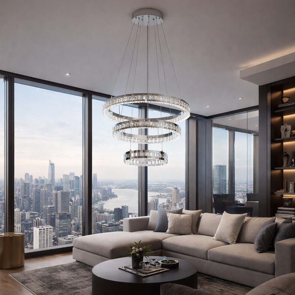 Il lampadario LED modello B50-3C è una soluzione elegante e moderna per l’illuminazione di ambienti interni. Il design sospeso con anelli luminosi dona un effetto scenografico raffinato, ideale per soggiorni, sale da pranzo, ingressi, camere da letto e ambienti commerciali dal gusto contemporaneo.