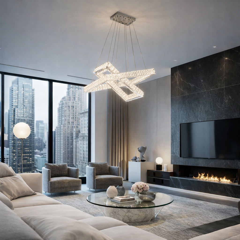Il lampadario LED a sospensione Univers B12-3C è una soluzione di illuminazione moderna e scenografica progettata per valorizzare ambienti residenziali e professionali. Il design contemporaneo con struttura luminosa incrociata crea un forte impatto estetico, rendendolo ideale per soggiorni, sale da pranzo, uffici, hotel e spazi commerciali.