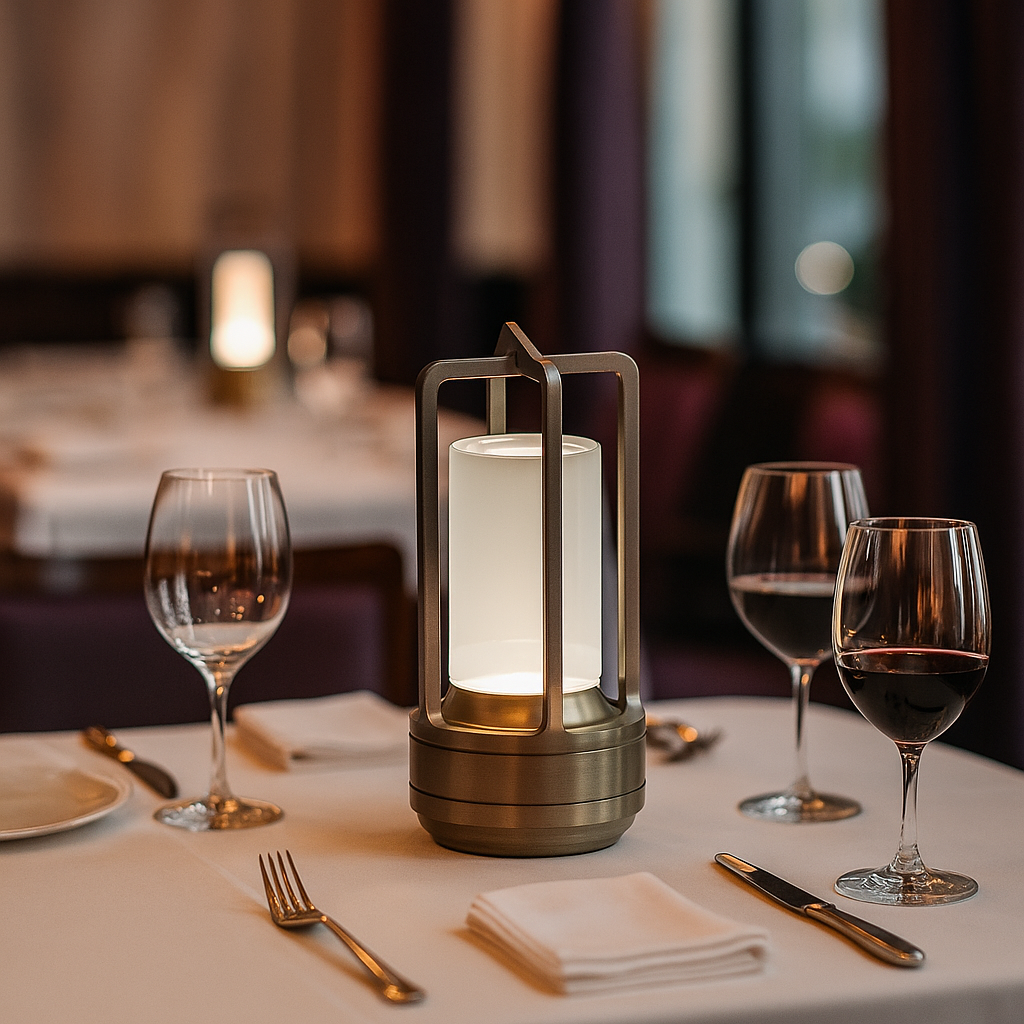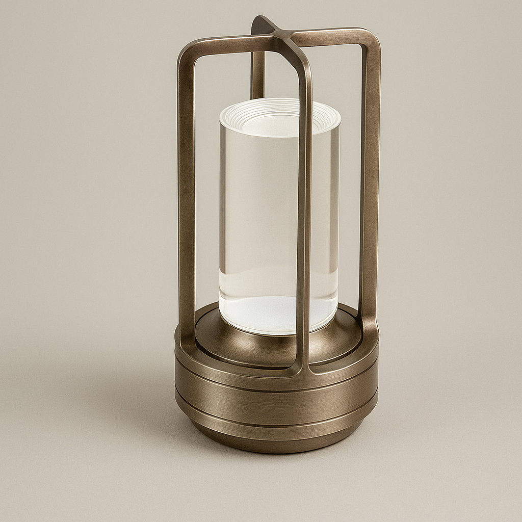 Lampada da tavolo LED con intensità e temperatura regolabili, corpo in alluminio.