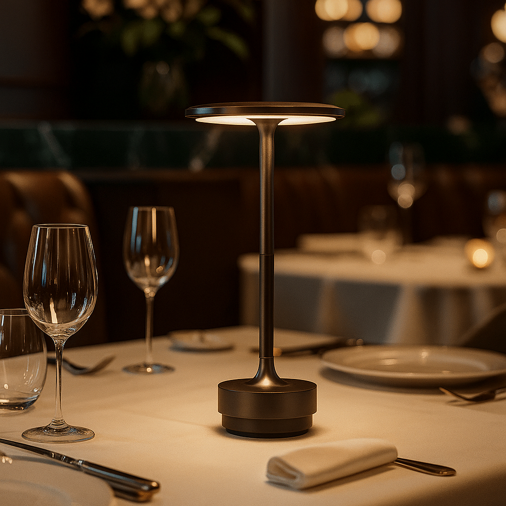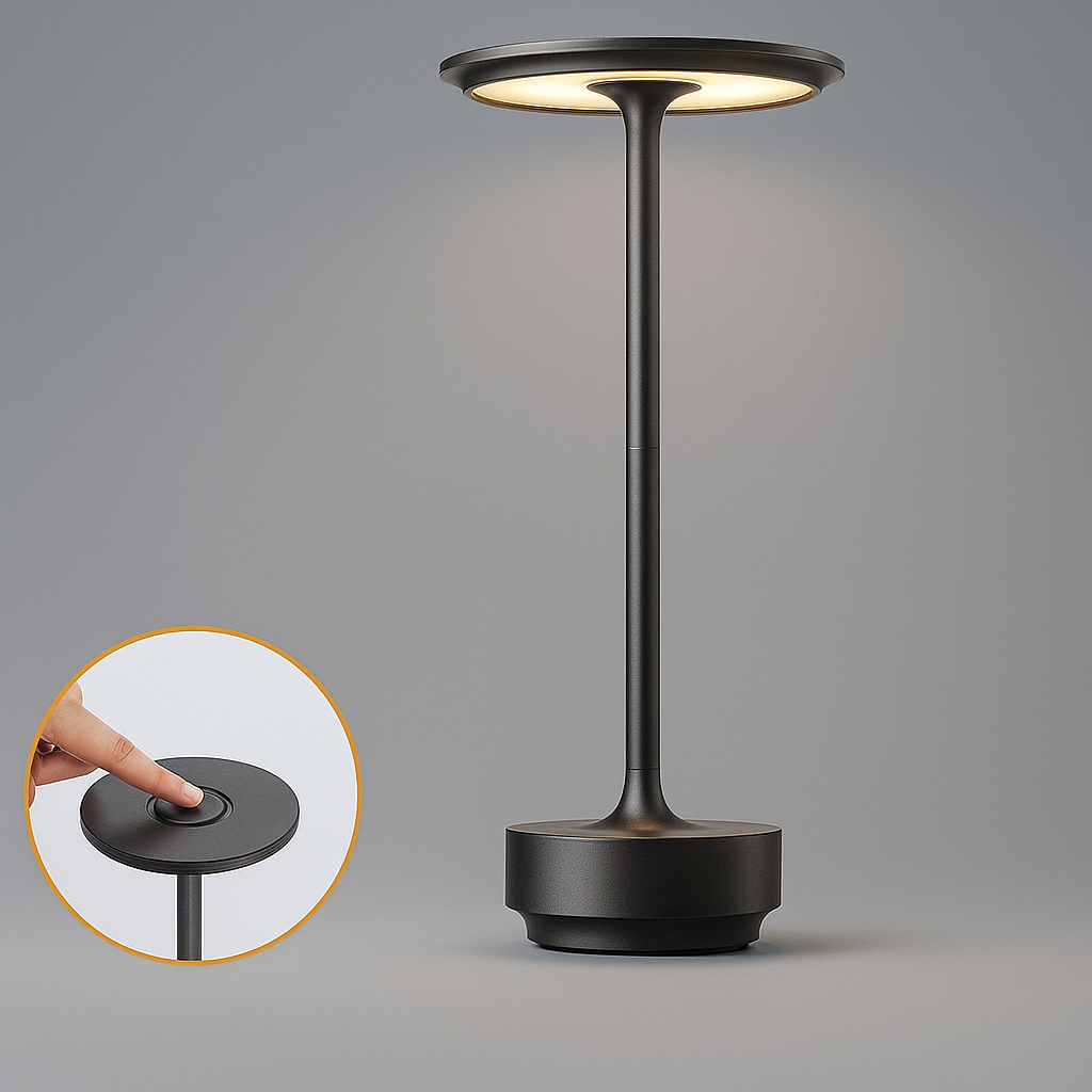 Lampada LED da tavolo ricaricabile in alluminio nero con intensità e temperatura regolabili.