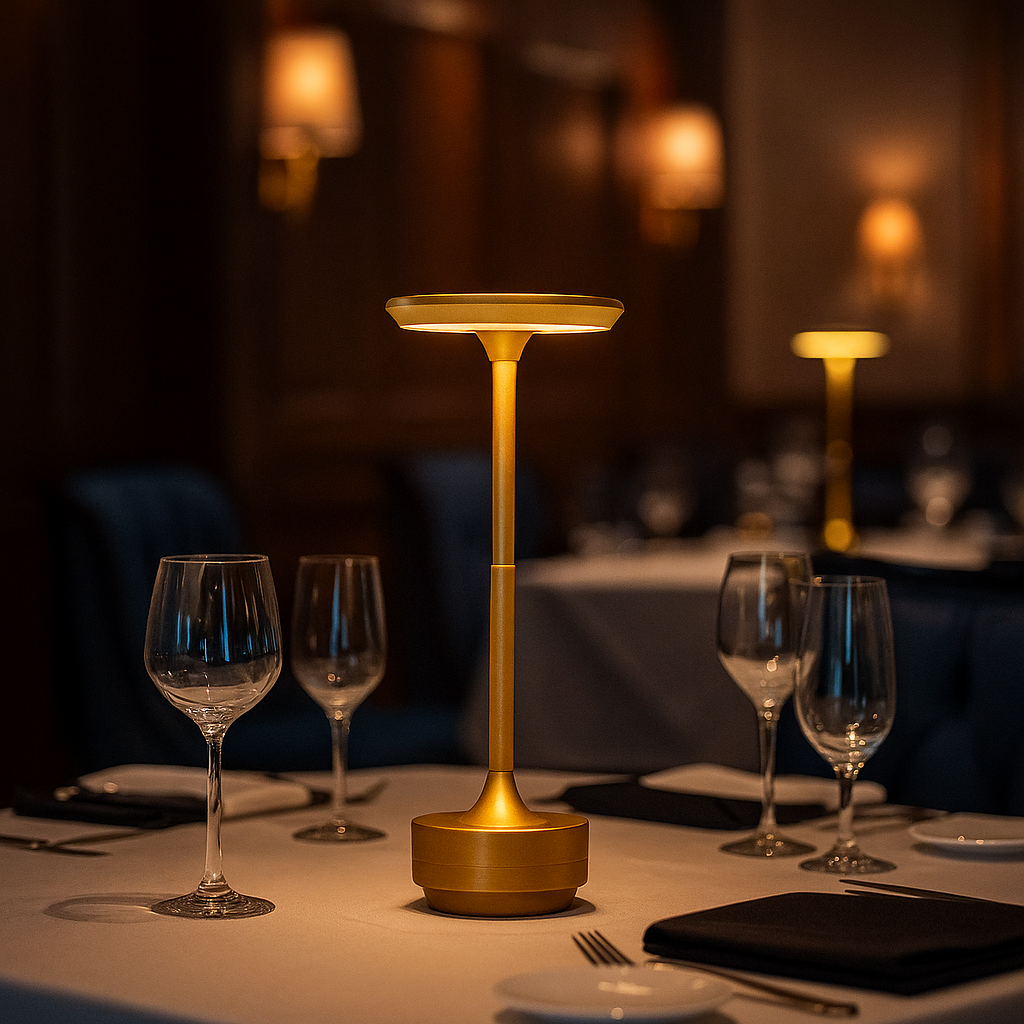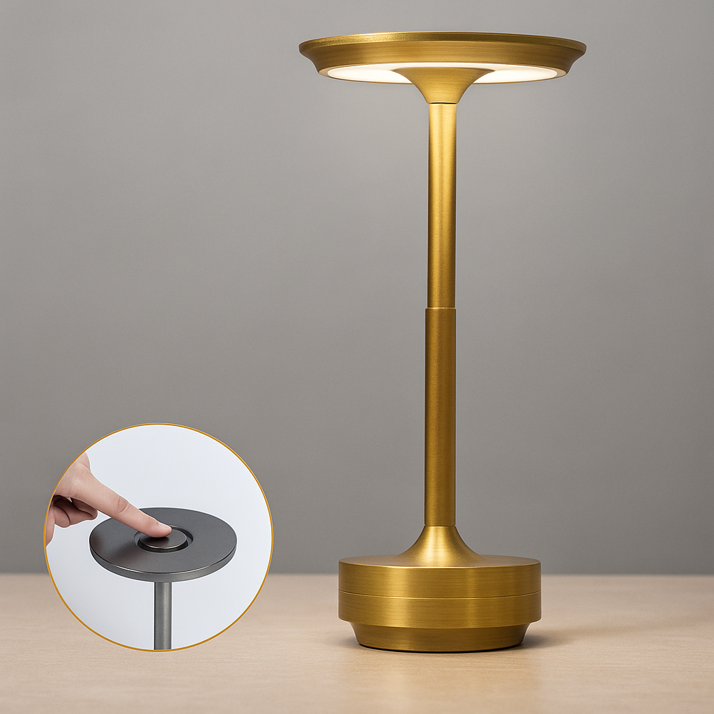 Lampada LED da tavolo ricaricabile in alluminio nero con intensità e temperatura regolabili.