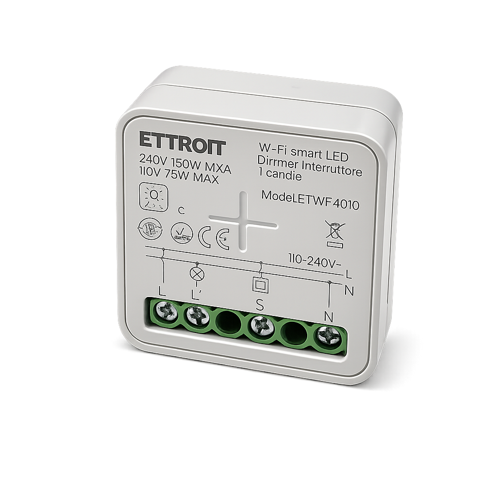 interruttore dimmer smart wi-fi progettato per il controllo e la regolazione dell’intensità luminosa di lampade led e luci tradizionali. ideale per impianti domestici e professionali, consente di gestire la luminosità direttamente da smartphone o tramite comando manuale.