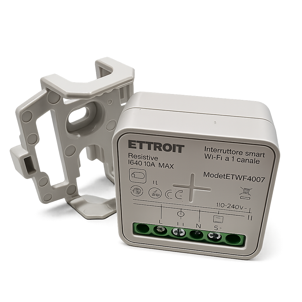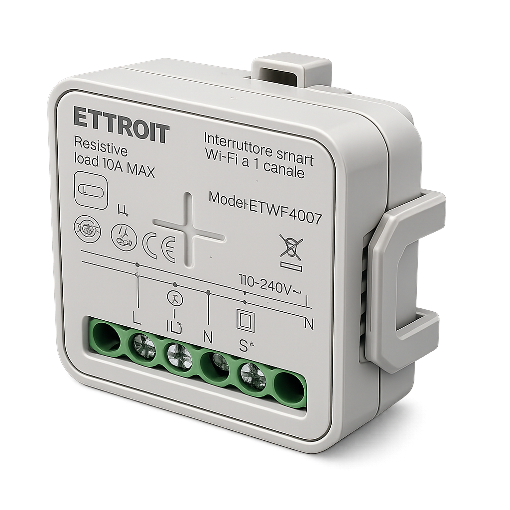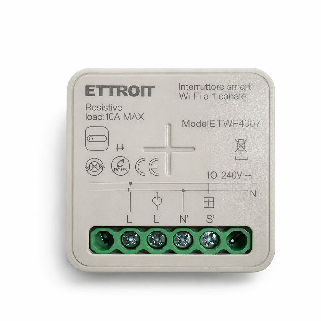 compatibile con alimentazione 110-240v ac, questo dispositivo permette il controllo di un singolo carico con collegamento diretto a fase e neutro. è dotato di ingresso per comando esterno (interruttore tradizionale), offrendo flessibilità sia in modalità smart che manuale.