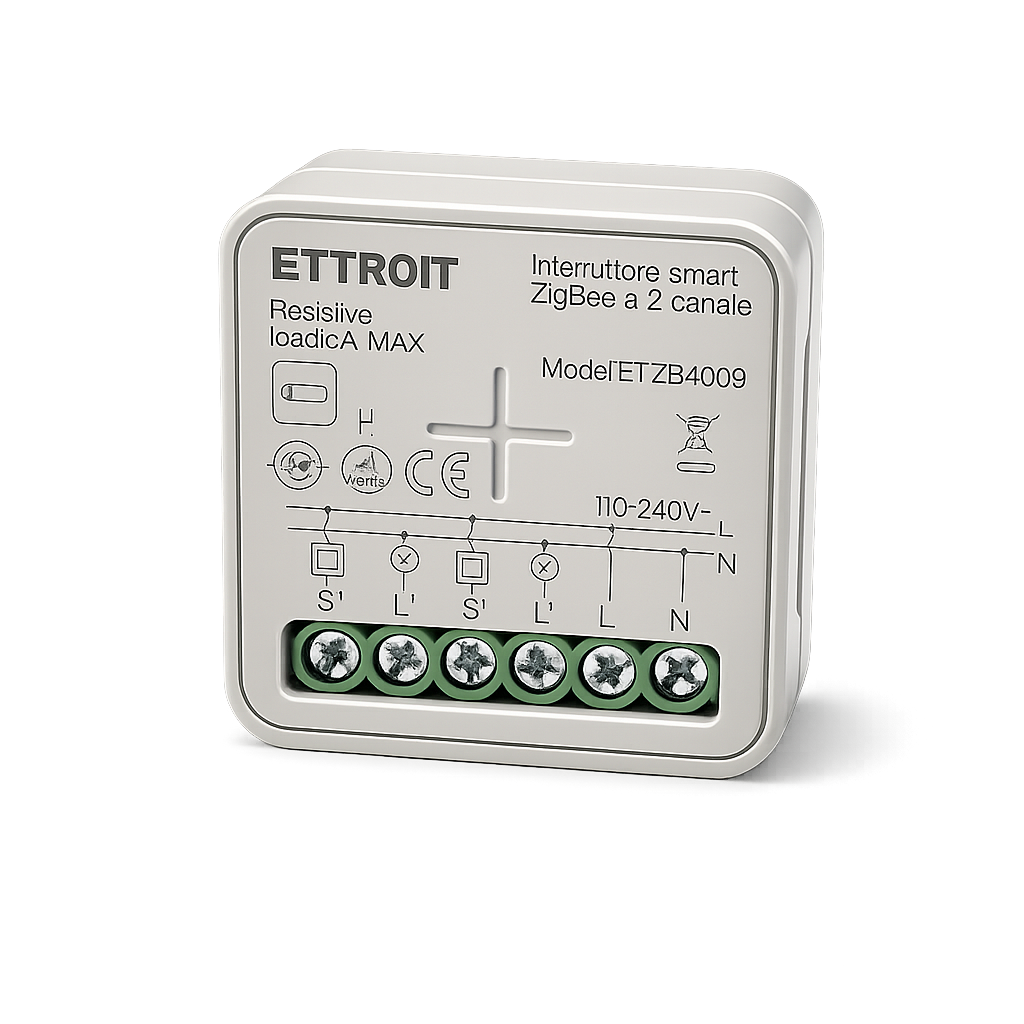 interruttore smart zigbee a 2 canali progettato per il controllo indipendente di due carichi elettrici, come lampade o linee luce separate. ideale per impianti domotici avanzati dove è necessario gestire più punti luce con un unico dispositivo.