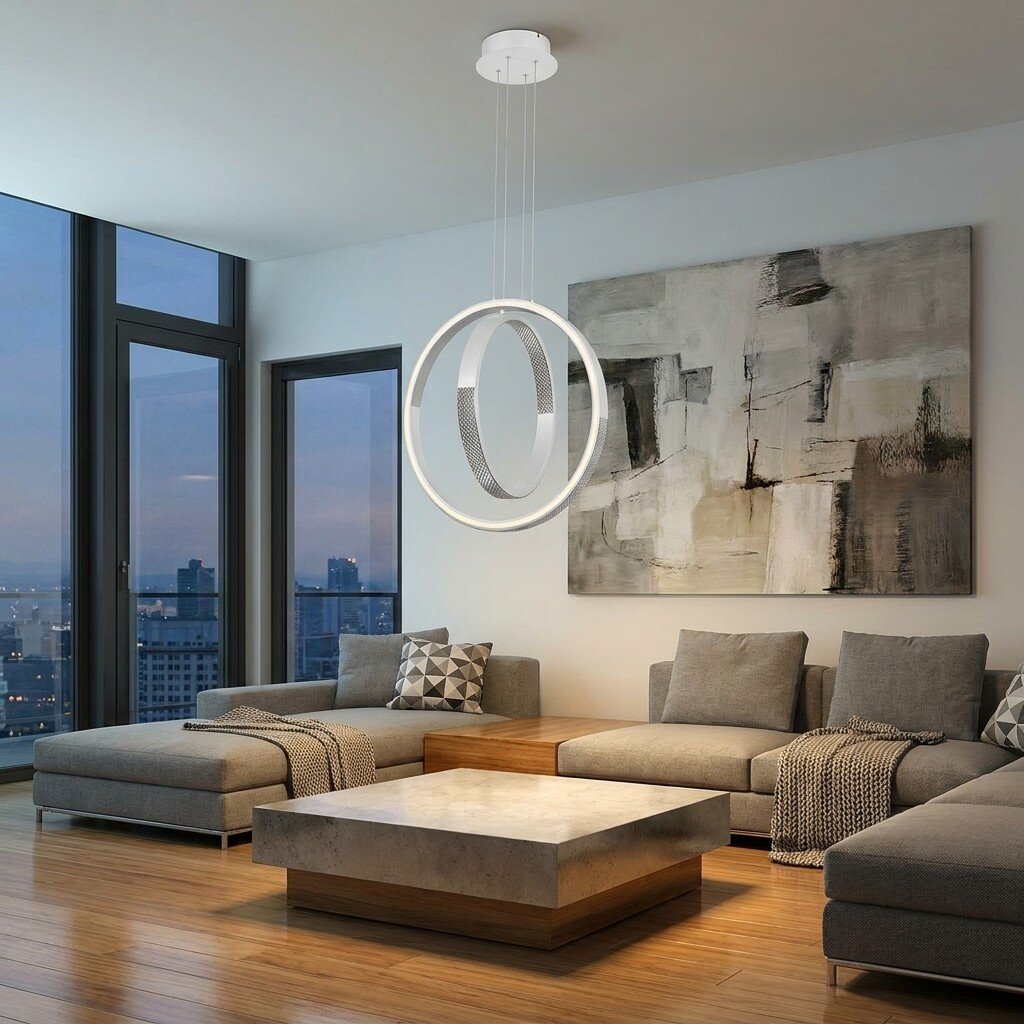Il lampadario LED a sospensione da 64W con struttura a doppio anello verticale intrecciato è una soluzione moderna e scenografica ideale per illuminare ambienti eleganti e contemporanei. Il particolare design con anelli sospesi crea un forte impatto decorativo, perfetto per soggiorni, sale da pranzo, ingressi e open space.
