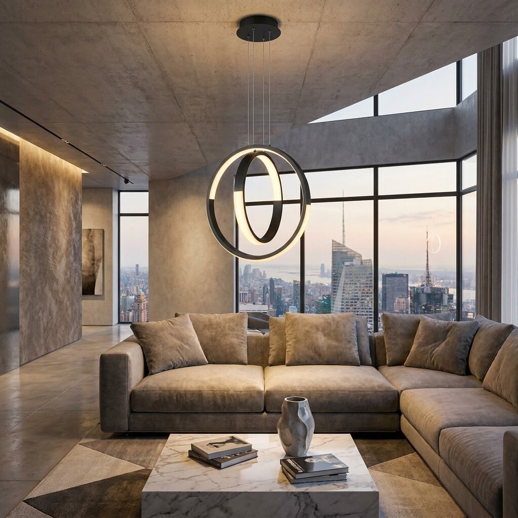Il lampadario LED a sospensione da 64W con struttura a doppio anello verticale intrecciato è una soluzione moderna e scenografica ideale per illuminare ambienti eleganti e contemporanei. Il particolare design con anelli sospesi crea un forte impatto decorativo, perfetto per soggiorni, sale da pranzo, ingressi e open space.