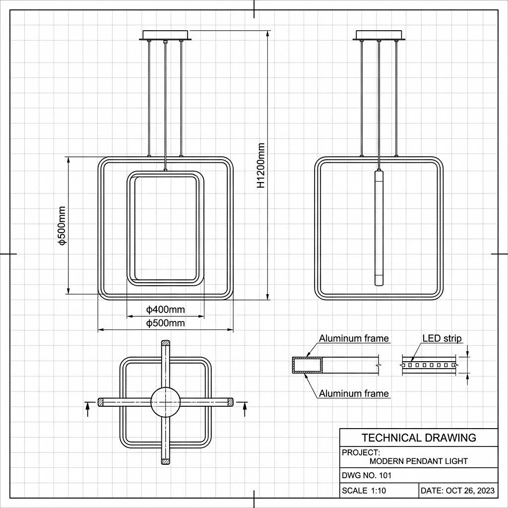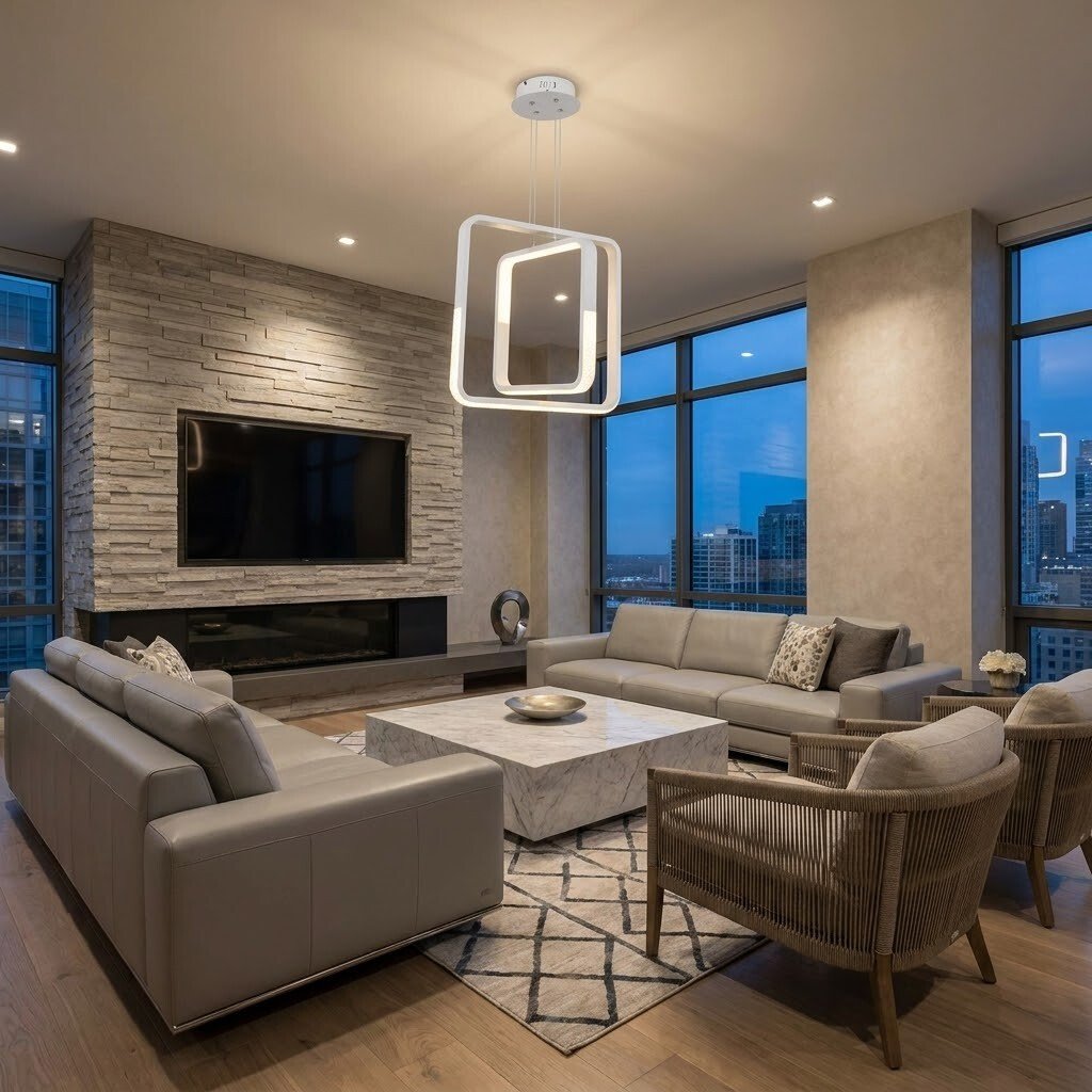 Il lampadario LED a sospensione da 64W con struttura a doppio telaio geometrico intrecciato è una soluzione moderna e decorativa ideale per illuminare ambienti eleganti e contemporanei. Il particolare design con due cornici sospese crea un effetto scenografico di grande impatto, perfetto per soggiorni, sale da pranzo, ingressi e open space.