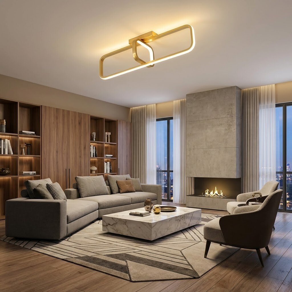 La plafoniera LED da 32W con design rettangolare moderno in elegante finitura oro è una soluzione decorativa raffinata per illuminare ambienti contemporanei con stile. La particolare struttura geometrica con doppio telaio luminoso crea un effetto moderno e scenografico, ideale per ingressi, corridoi, camere, soggiorni e ambienti di design.