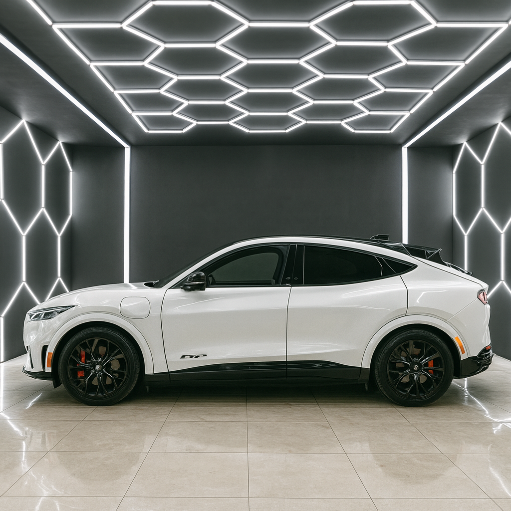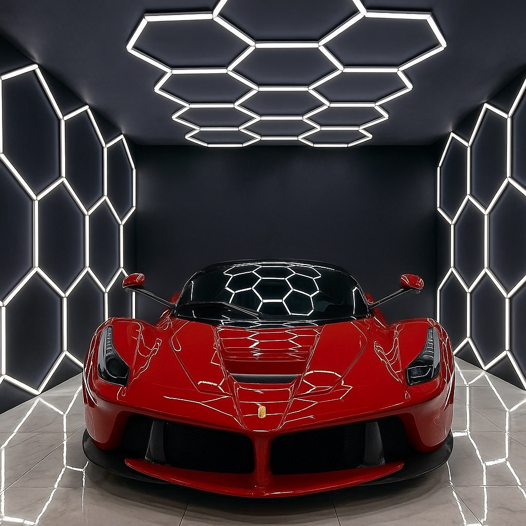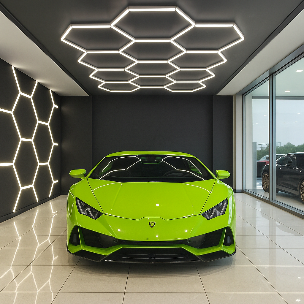 HEX-LED Modular Garage Lights – la soluzione definitiva per trasformare il tuo garage o showroom in uno spazio spettacolare, professionale e perfettamente illuminato.