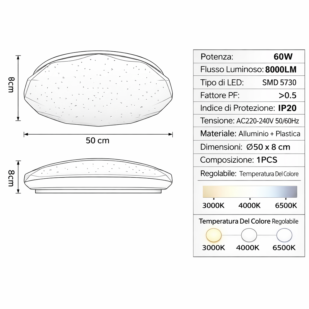 - Temperature colore disponibili: 3000K / 4000K / 6500K