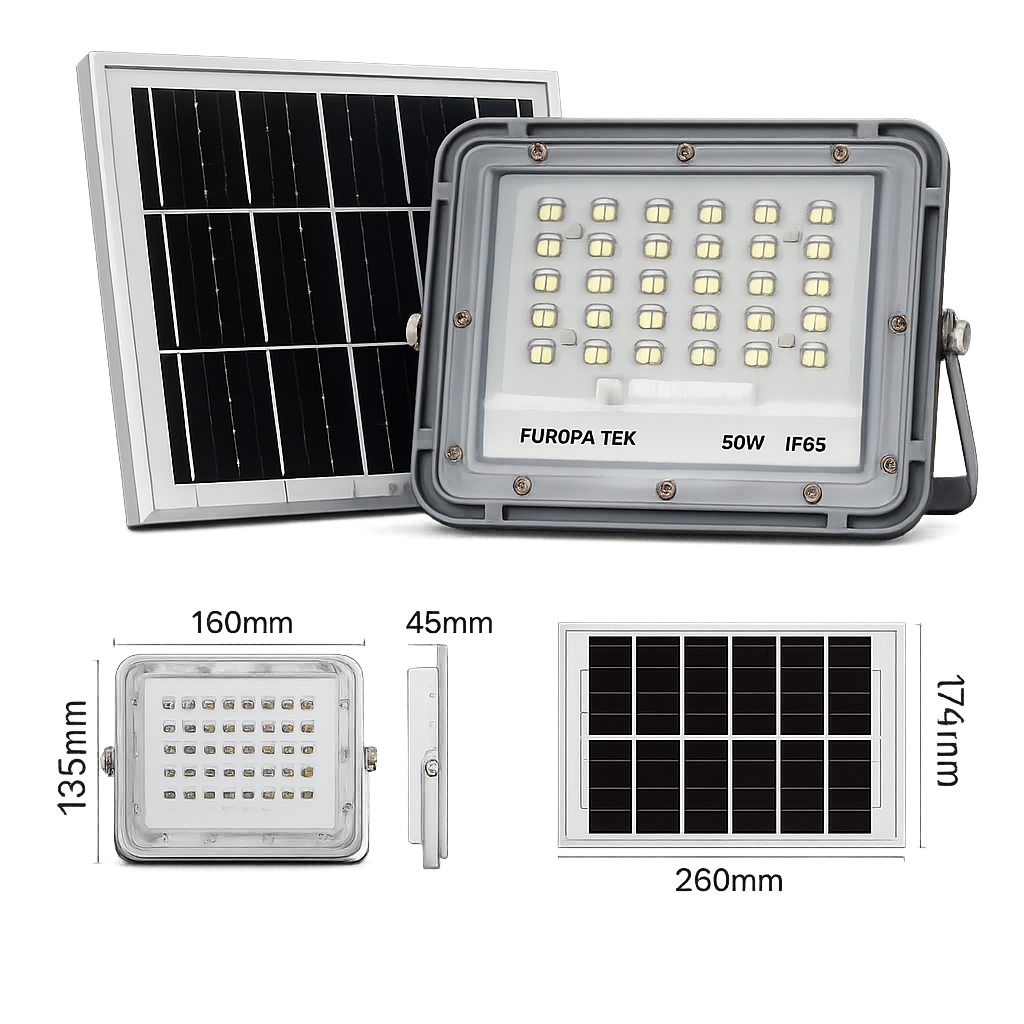 Grazie alla tecnologia LED ad alta luminosità, il faro solare 50W offre una luce intensa e stabile, ideale per migliorare la sicurezza e la visibilità notturna. La tonalità bianco freddo 6500K garantisce massima chiarezza e resa luminosa.