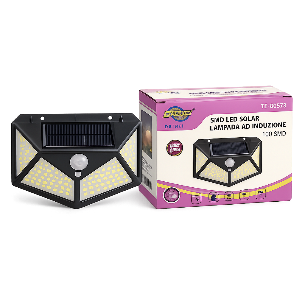 Dotata di 100 LED SMD ad alta luminosità distribuiti su tre lati, offre un’illuminazione ampia e uniforme con un grande angolo di copertura. Il sensore di movimento a infrarossi rileva il passaggio di persone o veicoli attivando automaticamente la luce, migliorando la sicurezza e riducendo il consumo energetico.