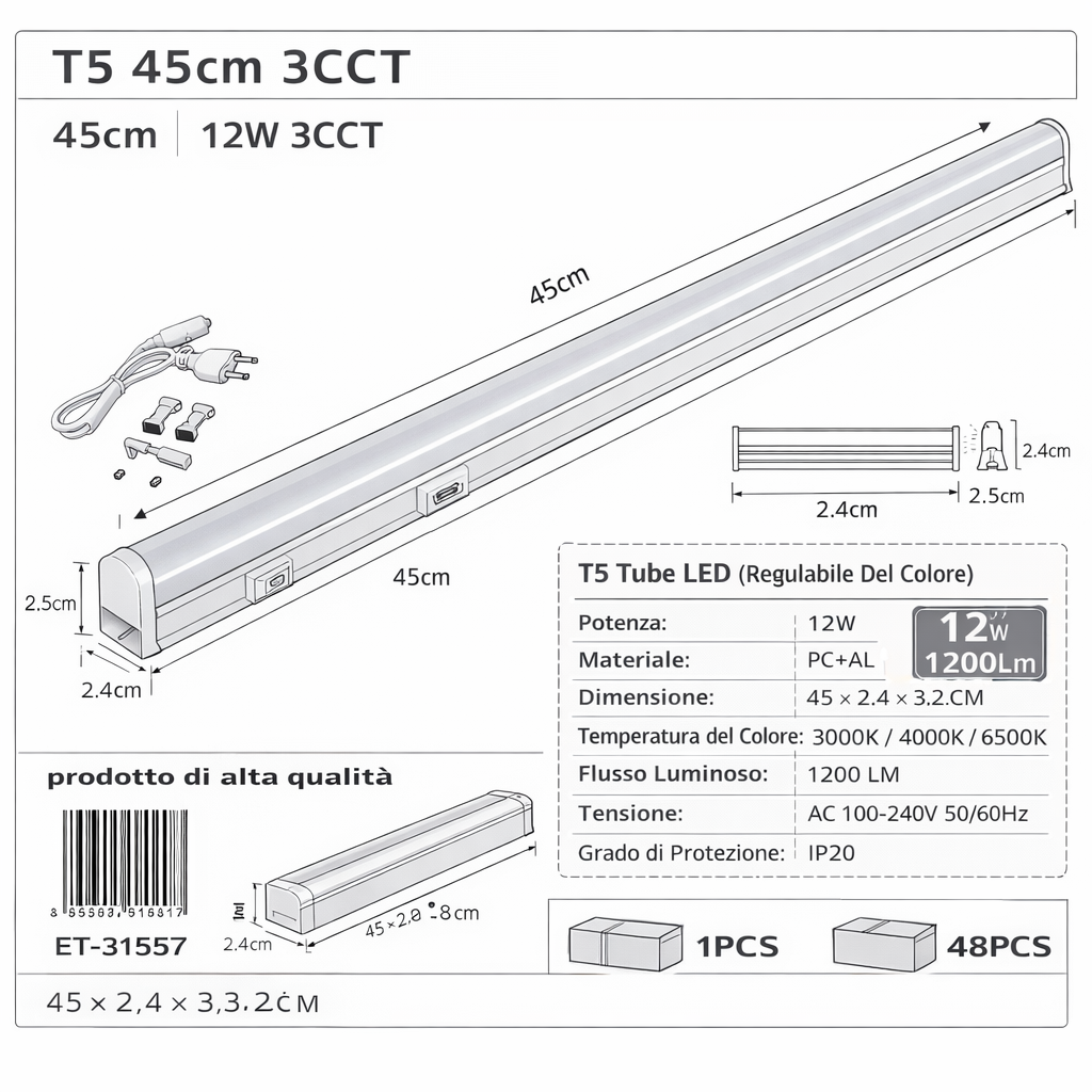 tubo led t5 da 45 cm ideale per illuminazione sottopensile, scaffali, banchi da lavoro e ambienti interni. garantisce una luce uniforme, efficiente e facilmente adattabile grazie alla selezione della temperatura colore.