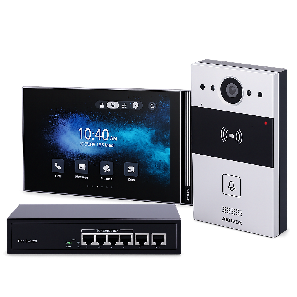 Il Akuvox AK-KIT05-IP-ANDROID è un kit videocitofonico IP professionale progettato per abitazioni, ville, uffici e piccoli condomini. Il sistema utilizza tecnologia PoE (Power over Ethernet), che consente di alimentare e collegare i dispositivi tramite un unico cavo di rete, rendendo l’installazione più semplice e ordinata.