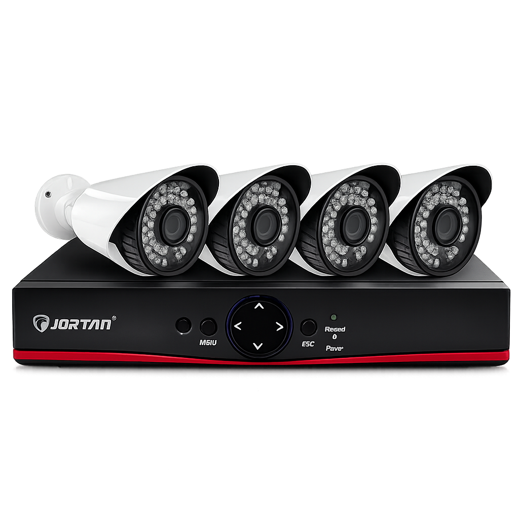 Il JORDAN 6146AHD-P4 è un kit di videosorveglianza AHD (Analog High Definition) pensato per realizzare un impianto di controllo affidabile in ambienti domestici e professionali. La confezione mostra un DVR abbinato a 4 telecamere bullet con illuminatori a infrarossi (anello LED) per la visione in condizioni di scarsa luce, ideale per il monitoraggio continuo di aree interne ed esterne.